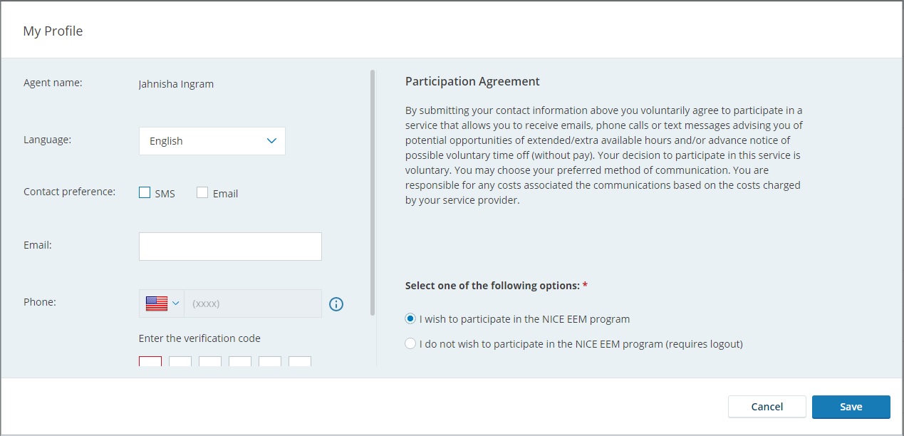 You must specify your contact information. Select whether you want to take part in the NICE EEM program. This program allows you to receive notifications of scheduling opportunities for extra hours or time off.
