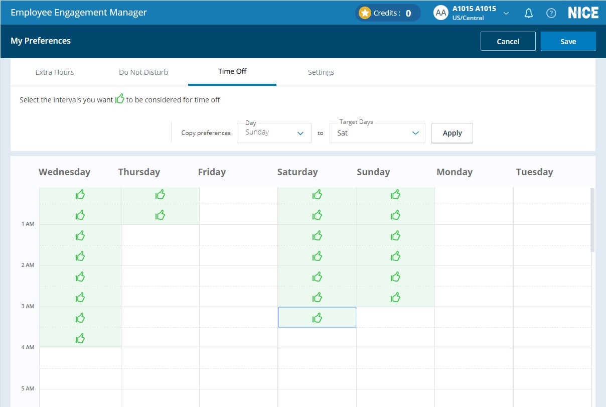 Select the days to copy the preference information to from the Target Days drop-down list.