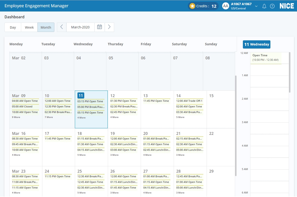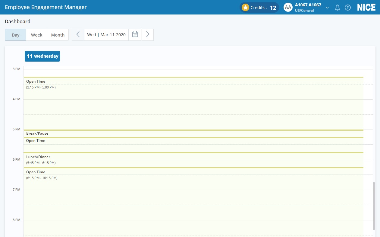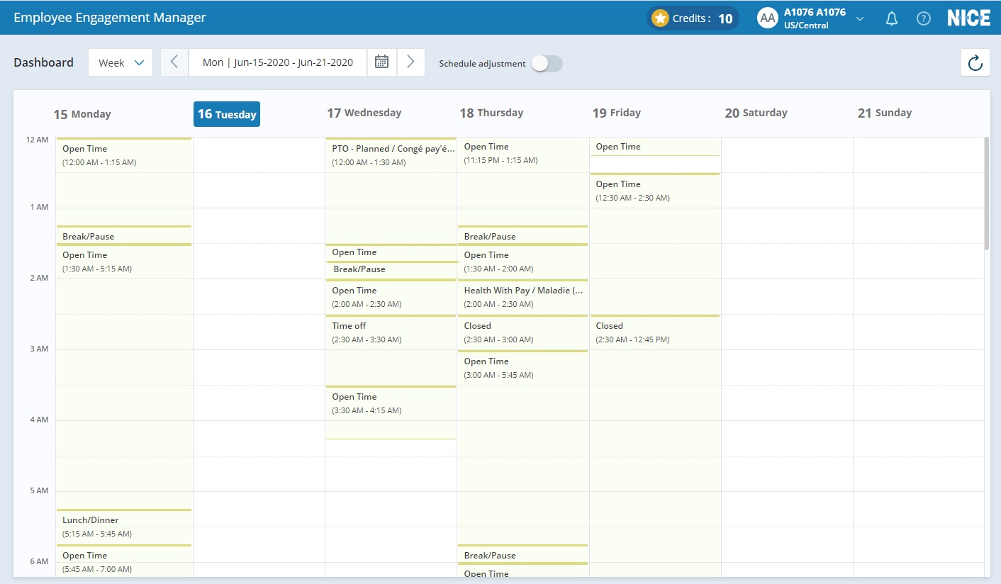 If your company enabled the Shift Currency feature, Credits displays the current balance of credits you earned for working extra credit intervals.